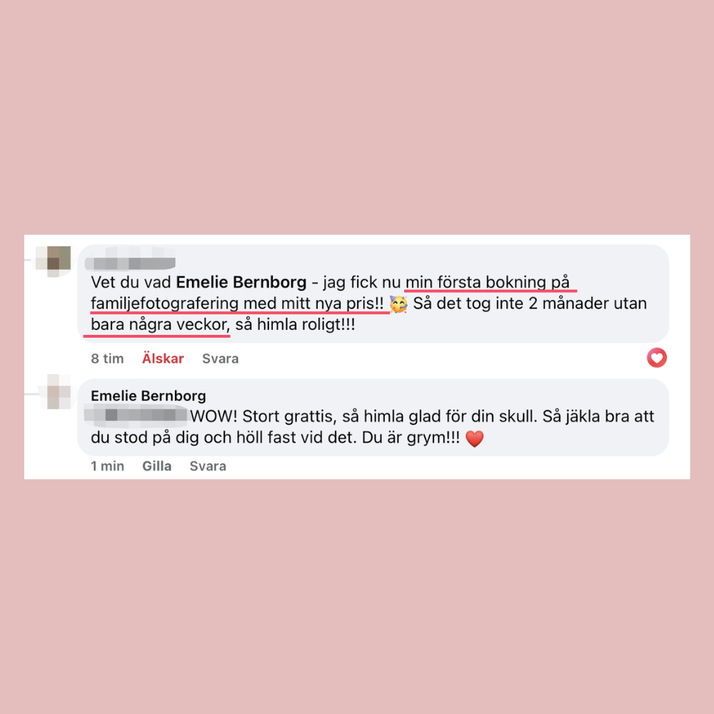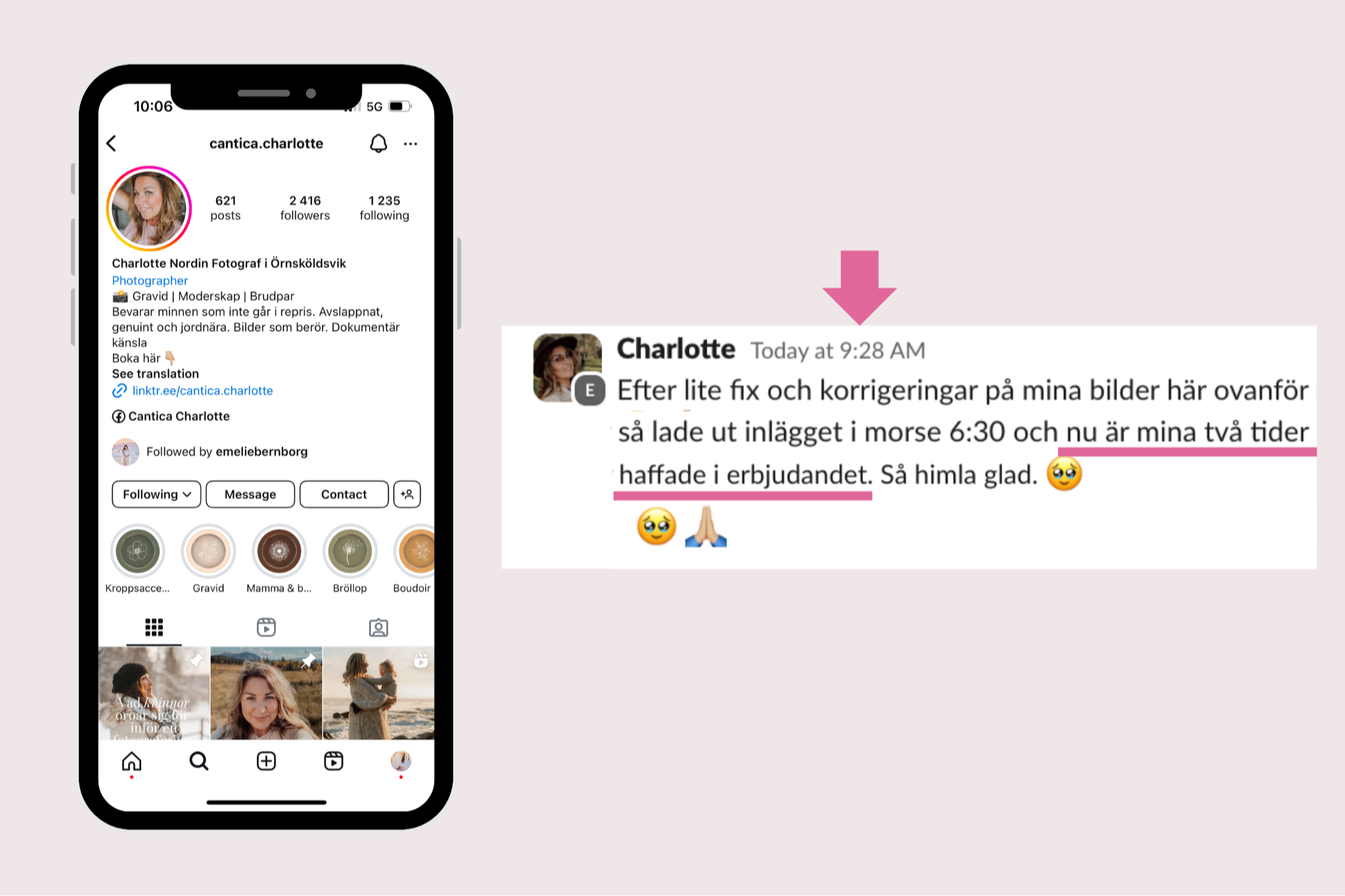"Woho! Jag testade Emelies strategi för att dra in bokningar på Instagram, och jag fick två bokningar på tre timmar, utan annonser! Vilken hit!"