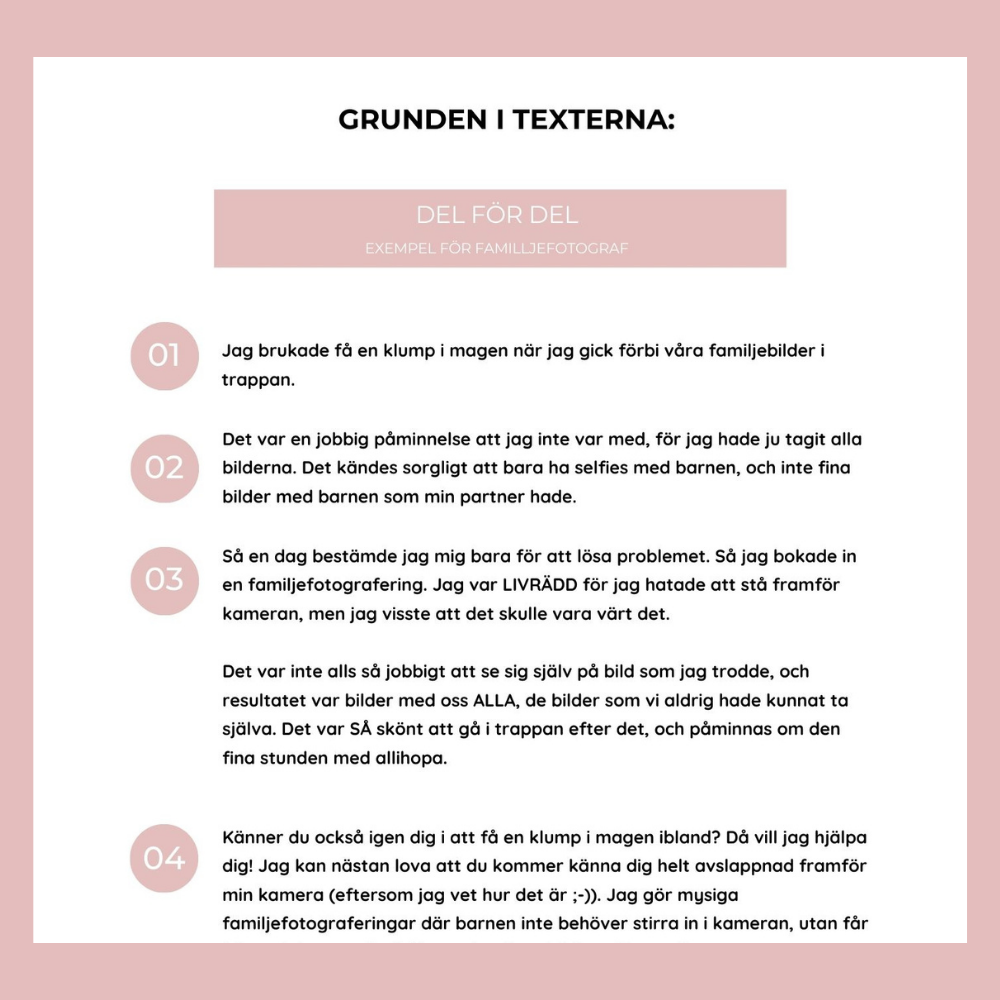 Här får du helheten du aldrig får i ett webinar: strukturen, strategin, texterna, säljpsykologin och stödet att faktiskt implementera. Det är detta som gör att fotografer går från förbiscrollade inlägg till regelbundna bokningar.